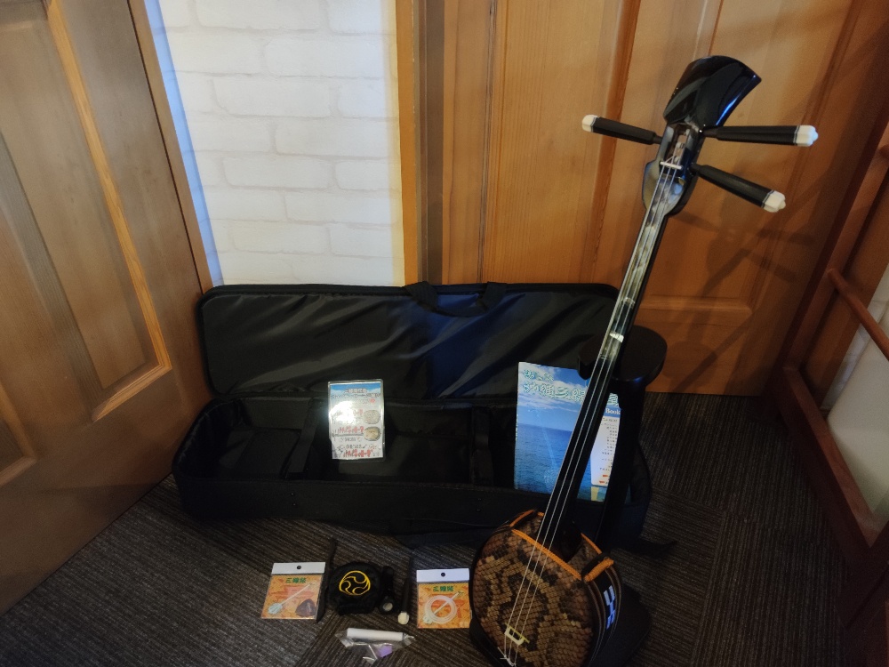 三線本体・ソフトケース・ソフトケース内小物入れ・バチ(爪)・ピック・予備弦3本セット・予備うま・予備カラクイ・減音うま・カラクイ止め・調弦カード・安心調弦チューナー(音が簡易に合わせられます)・工工四シール(指の押さえ位置)・三線教本(三線の持ち方、押さえ方、楽譜の読み方など初心者向けです)